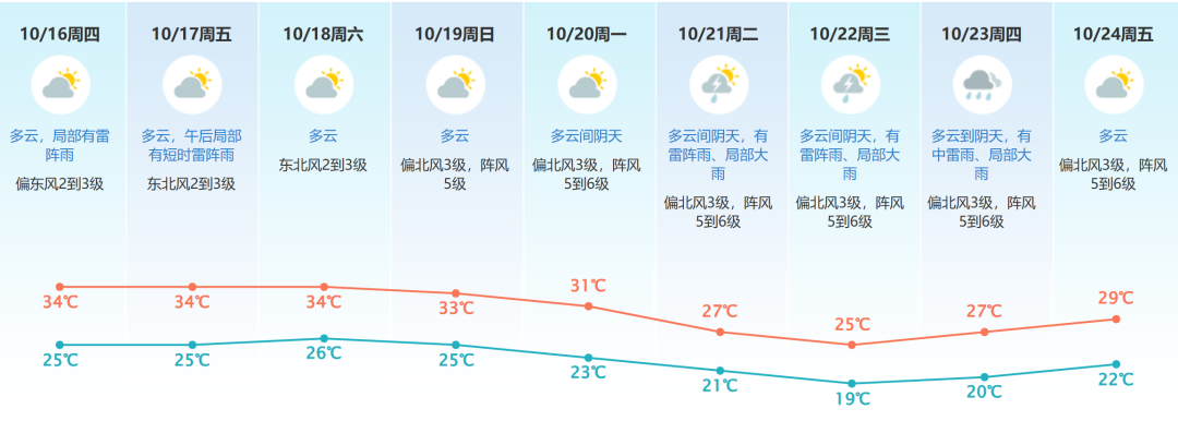 10月16日,茂名、粤北和珠江三角洲大部市县多云间阴天,有分散(雷)阵雨,其余市县多云,局部有(雷)阵雨。最高气温:粤西和粤北偏北市县29℃~32℃,其余大部市县32℃~35℃。