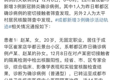 继12月7日成都新增2例本土确诊病例后,12月8日0-6时,成都再增3例新冠肺炎确诊病例(其中1人为昨日郫都区确诊病例的密切接触者筛查发现,另外2人为太平村居民核酸筛查中发现)。两…