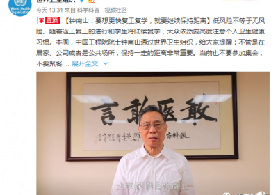今天下午1时许,@世界卫生组织 官方微博发布了一条微博并置顶,微博中,中国工程院院士钟南山提醒大家:想要更快复工复学,就要继续保持距离。视频↓↓视频据@世界卫生组织在视频中,钟南山…