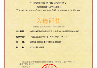 日前,科技部中国科技信息研究所发布了2021年度“领跑者5000——中国精品科技期刊顶尖学术论文(F5000)”入选名单。武汉市第九医院研究论文《中药连花清瘟治疗新型冠状病毒感染的…