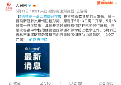 据吉林市教育局11日发布,鉴于目前新冠肺炎疫情防控形势,原定于5月13日高二开学、5月18日高一开学暂缓,具体开学时间视疫情防控形势另行通知,并要求各高中学校须继续做好停课不停学线…