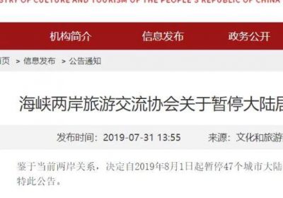 国家文化和旅游部官方网站昨天(7月31日)中午发布《海峡两岸旅游交流协会关于暂停大陆居民赴台个人游试点的公告》:鉴于当前两岸关系,决定自2019年8月1日起暂停47个城市大陆居民赴…