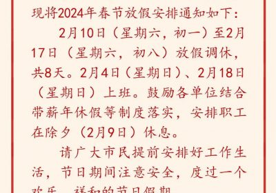 今天(1月12日)北京市人民政府办公厅正式发布关于2024年春节放假安排的通知↓↓↓通知称2月10日(星期六,初一)至2月17日(星期六,初八)放假调休,共8天。2月4日(星期日)…