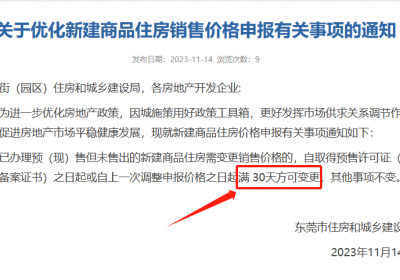 刚刚东莞市住建局官网发布重磅楼市通知:新建商品住房需变更售价的申请变更期限由360天缩短为30天↓↓↓▲官网截图据最新文件通知为进一步优化房地产政策已办理预(现)售但未售出的新建商…