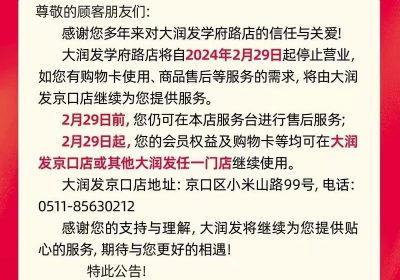 突发!就在近日大润发在江苏镇江、四川德阳、湖南株洲相继传出关店消息2月17日,大润发镇江学府路店发布公告称,该店将自2024年2月29日起停止营业,如消费者有购物卡使用、商品售后等…