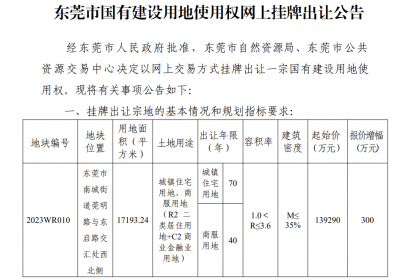 就在刚刚,东莞发布最新通知:相比之前的土拍有了重大变化土拍正式取消了最高限价上不封顶!“价高者得”!价高者得!东莞土拍取消最高限价刚刚,东莞最新住宅地块(2023WR010)挂牌。…