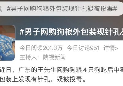 最近,猫狗被投毒的事情频频出现引起了不少爱宠人士的担忧而就在今日关于"男子网购狗粮外包装现针孔疑被投毒"再次让全网的网友关注与讨论!疑似投毒?广东有网友表示中招近日,广东的王先生称…