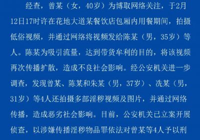2月19日,广州市公安局荔湾区分局通报“女子在海底捞包间拍不雅视频”一事:2024年2月14日下午,广州荔湾警方接到某餐饮店负责人报警,称有一名女子在其店内拍摄不雅视频,并在网上传…