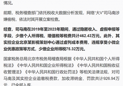 网络“大V”司马南偷税被罚超900万元,其全平台账号已在去年就停更。今天,国家税务总局北京市税务局稽查局公布司马南偷税案件处理情况。前期,税务稽查部门依托税收大数据分析发现,网络“…