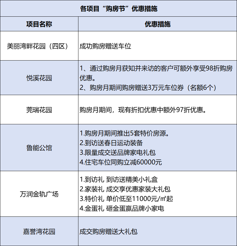 各在售项目同步推出专属福利,特价房、车位礼、家电礼全覆盖,具体优惠如下(以活动现场为准):