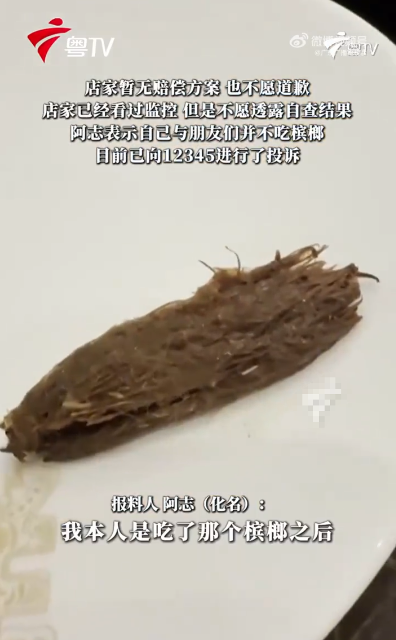 阿志表示他当场就吐了。在他提供的视频中,可以看到一个已经被嚼烂的槟榔。在拍照取证后,他立刻叫来了服务员。