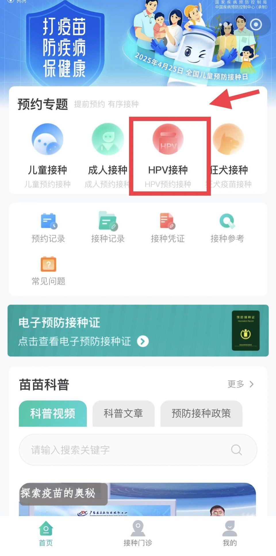 2. 选择疫苗:首页选“儿童接种/成人接种/HPV接种”→选疫苗类型