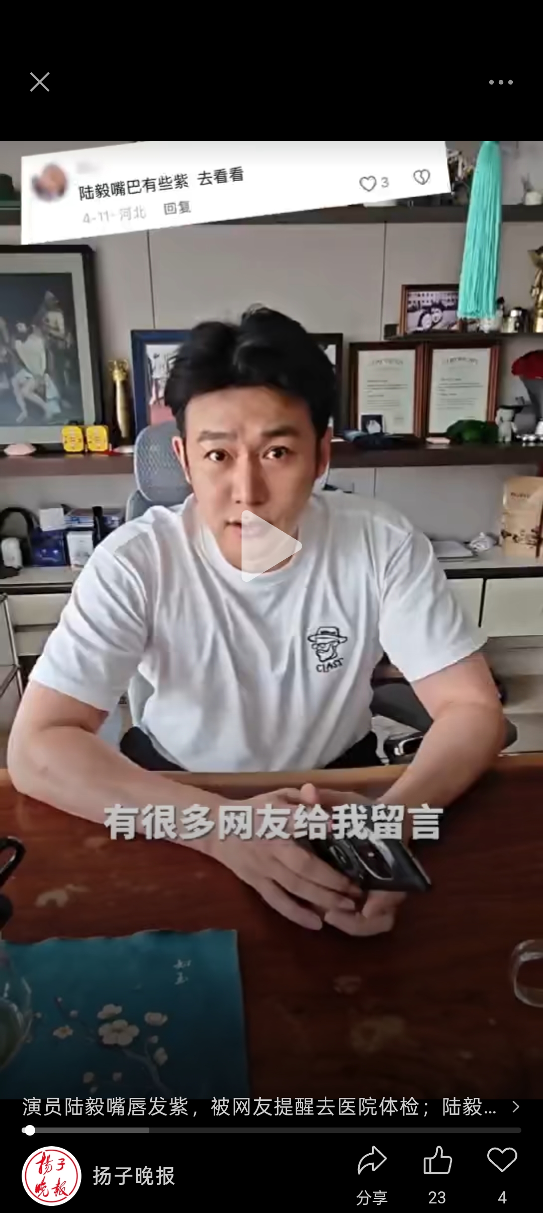 4月26日,演员陆毅在个人社交平台发体检视频,并配文称:“评论区都说嘴巴紫,响应网友的意见去医院做了个大体检,谢谢大家的关心啦!”